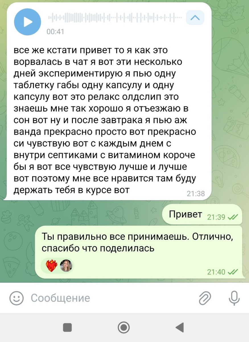 На скриншоте, автоперевод с голоса поэтому ошибки, но смысл вы поймете. Тревожность уходит, сон налаживается.