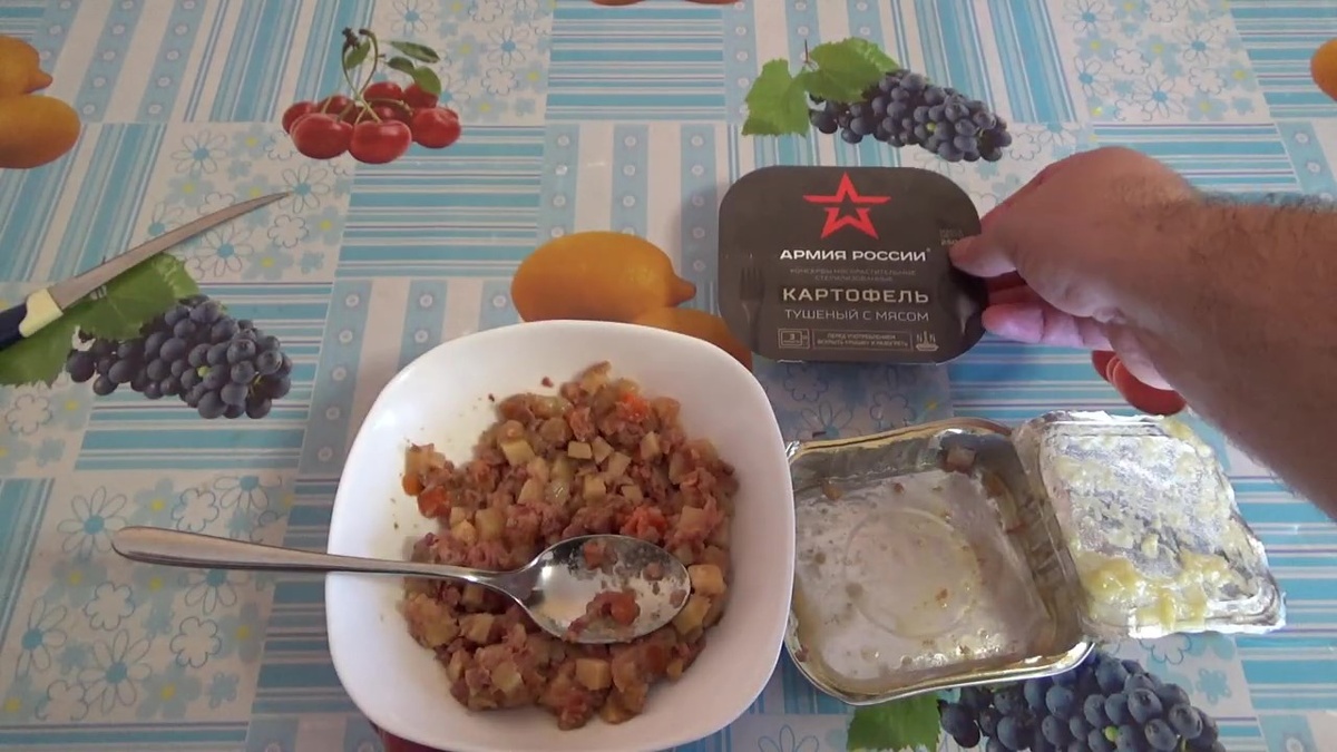 Всем привет дорогие мои друзья! С вами как обычно едаман, картофель тушеный с мясом был заказан с интернет-магазина озон. Там по-моему 109 рублей. Одна баночка, их было 2 всего. То есть как армейский сух-поек. Я думаю, те, кто служил в армии сразу узнают вот это корытце, как говорится, было очень много на полигонах и везде съедено таких вот разного плана консервов. Сейчас в приближенном рассмотрении я прочитаю состав, открою и покажу, что же "Армия России" нам предлагает. Смотрите, вот так выглядит 250 грамм масса нетто, перед употреблениям вскрыть крышку и разогреть. Так посмотрим, что у нас в составе: Мясо говядины картофель, морковь столовая свежая, лук репчатый свежий. Масло подсолнечная, мука пшеничная, соль, соль пищевая, зелень, перед душистой молотой, лавровый лист. Изготовитель ООО "Консерв суш прот". Адрес изготовления Россия Брянская область. Ну я не знаю, для армии России реально ли они такое делают или нет. Условия хранения, срок годности два года, мой экземпляр выпущен