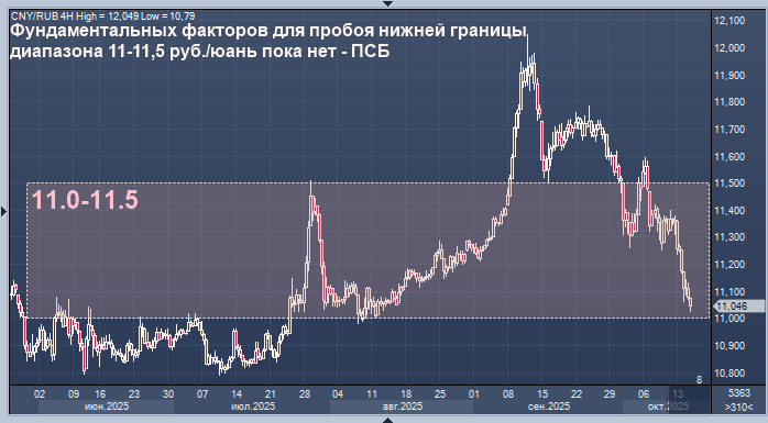 Фундаментальных факторов для пробоя нижней границы диапазона 11-11,5 руб./юань пока нет - ПСБ Курс доллара к рублю расчётный, фьючерс, вечный фьючерс и межбанк. Курс евро к рублю расчётный, фьючерс, вечный фьючерс и межбанк. Курс юаня к рублю биржевой, фьючерс, вечный фьючерс и межбанк. Фундаментальных факторов, способствующих пробою нижней границе диапазона 11-11,5 рубля за юань, в настоящее время не видно, говорится в комментарии управляющего по анализу банковского и финансового рынков банка ПСБ Богдана Зварича. "Юань во вторник, на наш взгляд, достиг цели коррекции, что может способствовать переходу китайской валюты к консолидации с попытками начать новую волну роста на фоне фиксации прибыли по коротким позициям, - пишет эксперт. - При этом в текущий момент мы не видим фундаментальных факторов, которые могли бы способствовать пробою нижней границе нашего текущего целевого диапазона 11-11,5 рубля за юань, выступающей ближайшей поддержкой. Более того, к концу недели ожидаем попыток вы