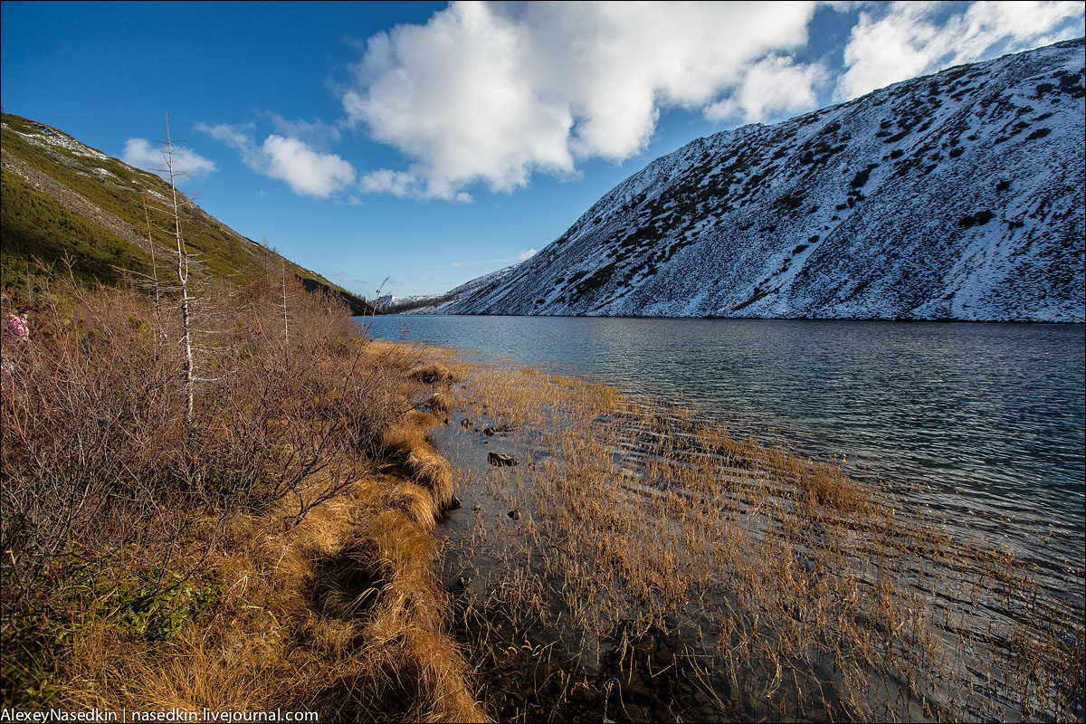 Если не присматриваться к специфической растительности, вполне можно подумать, что на фото какой-нибудь район горной Швейцарии. А на самом деле это озеро Галитур в трещине между горами, расположенное в Хасынском районе, приблизительно в трёхстах километрах от Магадана. Между прочим, глубиной оно более 700 метров. Это много. Озеро лежит под горой, которая называется "Чародей". Сейчас в октябре природа не так ослепительна, как летом или ранней осенью, но всё равно выглядит пейзаж