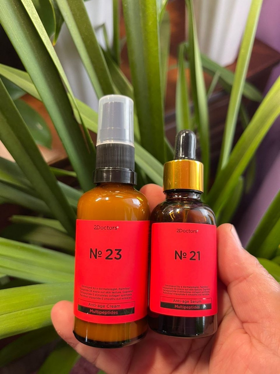 Расскажу, что же это за волшебное средство. Это крем и сыворотка для лица от бренда 2Doctors, созданного врачом-дерматологом с 20-летним стажем. Средства содержат мультипептиды, направленные на омоложение и улучшение состояния кожи. Не буду мучить вас сложными названиями, скажу только, что эти пептиды работают на разных уровнях - одни отвечают за эластичность и упругость кожи, другие уменьшают раздражения и способствуют заживлению повреждений, третьи стимулируют клеточное обновление.