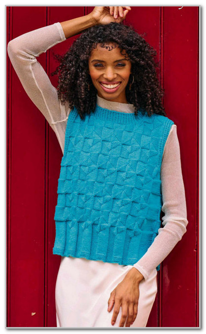Ромбы и шестиугольники мозаично расположены по всему дизайну безрукавки с круглым вырезом горловины. Текстуры лицевой и изнаночной вязки создают рельефный вид на изделии. Нижний край безрукавки связан широкой резинкой, которая переходит в плиточный узор верхней части тела, а текстурная резинка используется для краев пройм и горловины. Модно и свежо!