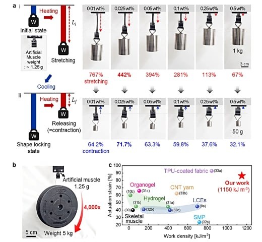 Искусственные мышцы Китайские исследователи создали искусственную мышцу, которая «растягивается как резина, крепкая как сталь» Состояние мышцы можно регулировать, и нагрузка, с которой работает мышца, может быть в 4000 раз больше ее собственного веса, сама мышца растягивается в 12 раз. Все это появилось благодаря новому полимерному материалу с эффектом памяти формы. Технология разрабатывается для «мягких» роботов, экзоскелетов и человеко-машинных интерфейсов.