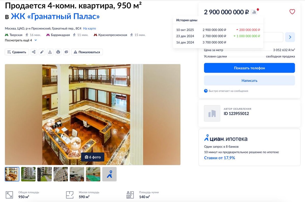 Двухэтажная квартира площадью почти 1000 метров с шестью санузлами (один совмещенный, если это важно) в Гранантном переулке за день подорожала на 200 млн рублей. Жилье в известном доме по некоторым данным принадлежит вдвове бывшего мэра Москвы Елене Батуриной.