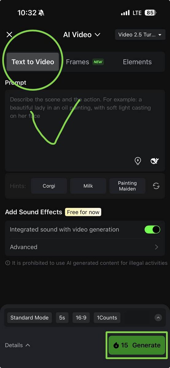 4. Выбираем текст на видео, чуть ниже пишем промт и монтируем