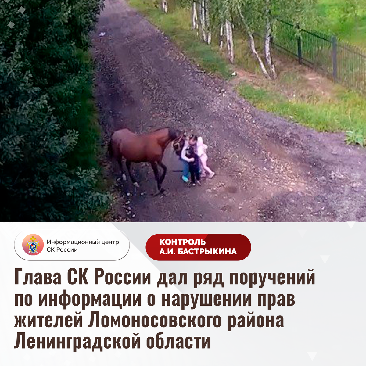 Глава СК России дал ряд поручений по информации о нарушении прав жителей Ломоносовского района Ленинградской области В эфире федерального телеканала сообщалось о нарушении прав жителей СНТ «Орбита-3» Ломоносовского района Ленинградской области. Местный житель на территории домовладения занимается разведением лошадей, систематически нарушая правила их содержания. Животные регулярно покидают участок и нападают на граждан, повреждают их имущество. В октябре текущего года одна из лошадей причинила многочисленные телесные повреждения женщине. Потерпевшей потребовалась медицинская помощь. На замечания местных жителей мужчина реагирует агрессивно. В СУ СК России по Ленинградской области возбуждено уголовное дело по ст. 293 УК РФ (халатность). Кроме того, региональным следственным управлением инициирован вопрос о передаче уголовного дела, возбужденного по факту причинения тяжкого вреда здоровью женщине, из органов внутренних дел в свое производство. Председатель Следственного комитета Российс