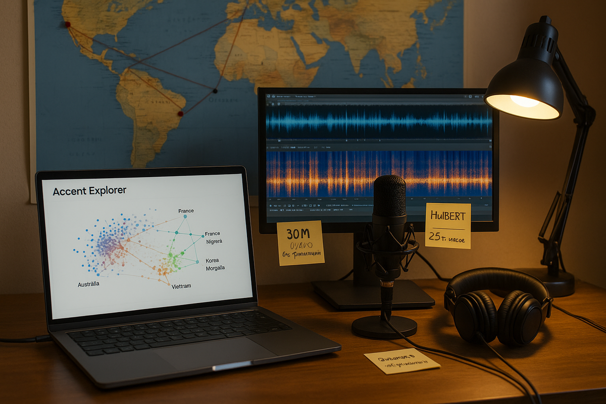 Мир языков — это не только слова и грамматика, но и акценты, отражающие историю, миграцию и культурные контакты. Команда BoldVoice решила взглянуть на это глазами искусственного интеллекта — точнее, его ушами. Результатом стал проект Accent Explorer: интерактивная 3D-визуализация, показывающая, как ИИ группирует акценты английской речи без всяких текстов или лингвистических подсказок. В основе проекта лежит модель HuBERT — это аудио-фундаментальная нейросеть, обученная понимать структуру речи без транскрипций. Инженеры BoldVoice дообучили её на 25 000 часах речи от 200 носителей разных языков, не предоставляя модели ни текстов, ни расшифровок — только голос. 🎛️ Архитектура модели выглядит так: Итого: 94,6 млн параметров, неделя обучения на кластерe NVIDIA A100 и 30 млн звуковых фрагментов. Модель анализирует только звучание, а не смысл, и именно это делает результат особенно чистым — мы видим не лексику, а музыку речи. После обучения исследователи применили метод UMAP для проекции мно