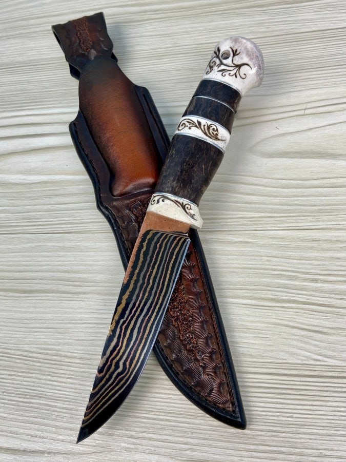 Рукоять из стабилизированной карельской берёзы с коричневым рогом лося и пирографией — не просто удобна, а завораживает деталями.