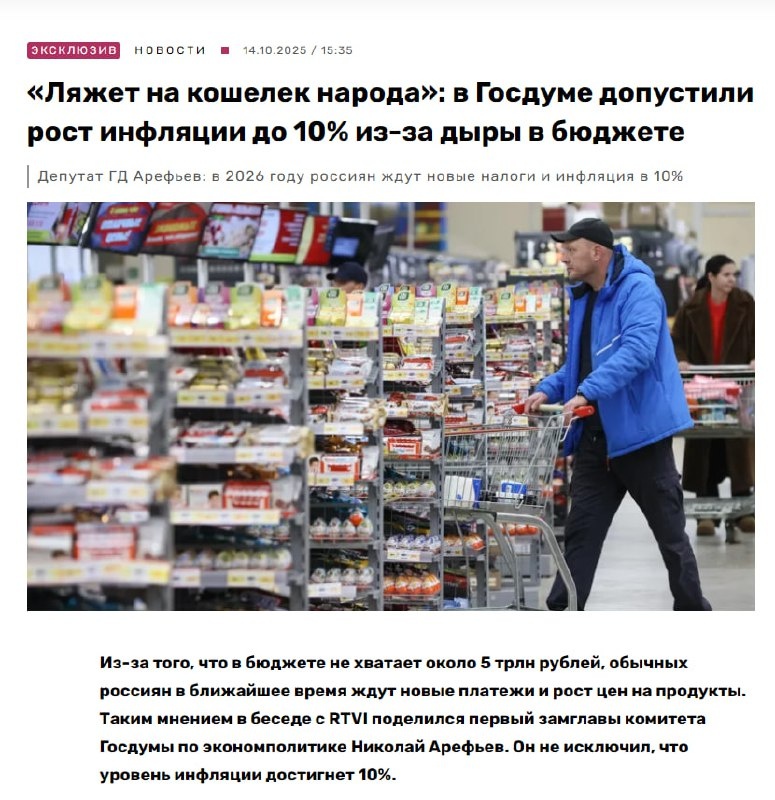 ⚡️ Дефицит бюджета может ударить по карману: россиян ждут новые налоги и рост цен. Замглавы комитета Госдумы по экономической политике Николай Арефьев заявил, что в бюджете не хватает 5 трлн рублей, и уже даны указания «искать деньги». По его прогнозам, инфляция в 2026 году может достичь 10 %, а рост цен и новые налоговые нагрузки коснутся прежде всего продуктов и услуг. ➡️ В числе мер, которые рассматриваются: возвращение налога на обслуживание банковских карт, рост коммунальных платежей в 2026 на 12 %, а также возможное повышение НДС до 22 %. «Все инициативы у нас ложатся на кошелёк народа. … Для народа это ничего хорошего не сулит — будут дополнительные платежи», — предупреждает Арефьев. ❕ Арефьев подчеркнул, что индексации пенсий или пособий, вероятно, будут ниже уровня инфляции, а рост тарифов и цен на услуги отразится сильнее на обычных гражданах. #налоги@bazaestate 🏠 Недвижимость Live 📱 Dzen
