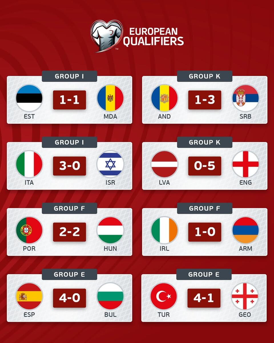 Чемпионат мира - 2026 – квалификация (Европа, 4-й игровой день) Группа Е Проходной матч для чемпионов Европы. Многие лидеры испанцев отсутствовали, но от разгрома гостей это не спасло. У Болгарии был только один шанс за весь матч. Сборная Грузии не смогла навязать борьбу Турции за второе место в группе. Команда Монтеллы продавливала Грузию весь матч и решила исход встречи уже в первом тайме. Грузины отметились шикарным голом престижа. Хакан Чалханоглу провел свой сотый матч за сборную. Группа F Самоотдача Венгрии принесла свои плоды. Собослаи приносит одно очко своей сборной. Португальцы обстучали каркас ворот гостей и не решили исход в свою пользу. Криштиану Роналду стал лучшим бомбардиром в истории отборов на чемпионат мира с 41 голом. Чемпионат мира - 2026 – квалификация (Европа, 8-й игровой день) Группа I Банда Гаттузо продолжает ждать осечки норвежцев. Второе место в группе итальянцы себе уже гарантировали. Не выход на третий подряд мундиаль будет катастрофой для «Скуадры Адзу