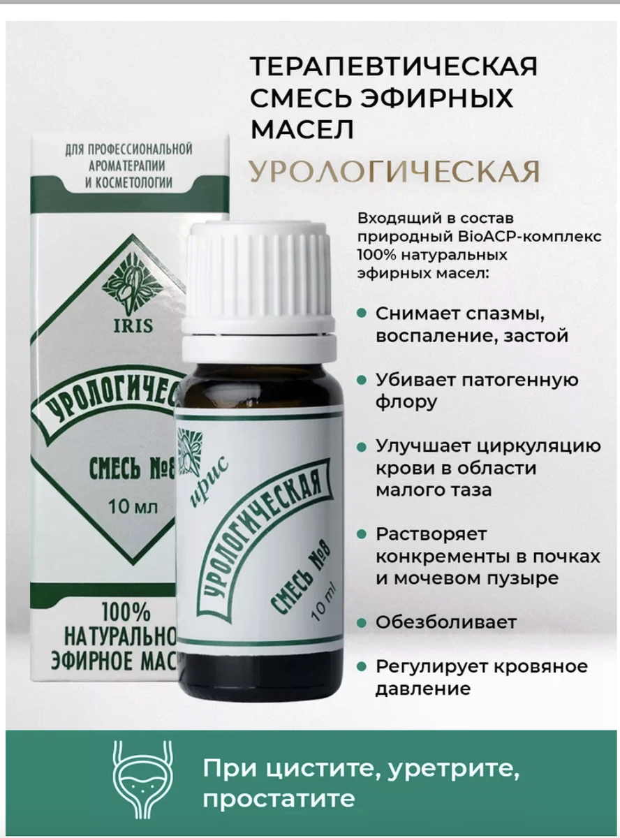 Смесь эфирных масел "Универсальная" №8 "Урологическая" - это эффективное средство для лечения и профилактики урологических заболеваний. Производится в России компанией "Ирис Центр Ароматерапии", которая зарекомендовала себя на рынке как надежный производитель натуральных и безопасных продуктов. Показания к применению: смесь эфирных масел эффективна при лечении цистита, уретрита, простатита, пиелонефрита (вне стадии обострения) и мочекаменной болезни. Действие смеси эфирных масел направлено на снятие воспаления, спазмов, застоя, уничтожение патогенной флоры и улучшение циркуляции крови в области малого таза. Она также способствует растворению конкрементов в почках и мочевом пузыре и выведению их из организма. Применение смеси эфирных масел "Универсальная" №8 "Урологическая" включает в себя различные способы: общие сидячие ванны, массаж нижних отделов живота, прием внутрь. Важно отметить, что перед применением смеси эфирных масел внутрь, необходимо проконсультироваться с врачом.