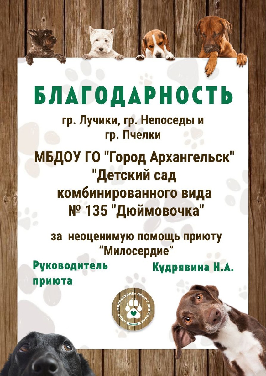 Выражаем огромную благодарность группам "Лучики", "Непоседы" и "Пчёлки" из МБДОУ ГО "Город Архангельск" "Детский сад комбинированного вида № 135 "Дюймовочка" за их активное участие в нашей благотворительной акции "Килограмм ДОБРА"!🐾🎁 Ваши малыши, их родители и, конечно же, замечательные воспитатели проявили невероятную щедрость и отзывчивость. Каждый собранный килограмм продуктов – это частичка вашего тепла, заботы и желания помочь тем, кто в этом нуждается❤️ Отдельное спасибо Ирине Геннадьевне Путиловой за организацию благотворительной акции в детском саду🌸 Как здорово, что есть такие неравнодушные и добрые люди, как вы! Ваше участие в акции "Килограмм ДОБРА" – это яркий пример того, как маленькие дела могут привести к большим результатам. Спасибо вам за то, что вы делаете мир вокруг нас добрее!🍀