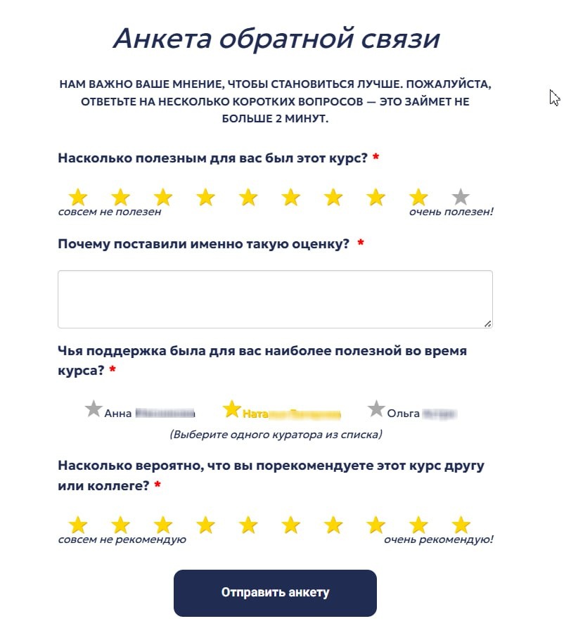 Давно не делала звёздный рейтинг. В этот раз задача усложнилась тем, что в выборке были не только цифры (определить уровень полезности), но и выбрать конкретного куратора. И звездочки хотелось у кураторов оставить и имена самих кураторов не скрывать и чтобы только одна звездочка загорелась. У меня всё получилось ⭐️ _______________ Сделать заказ на что-то интересное и необычное - пишите в Telegram 👉 @laro4kafr #урок #анкета