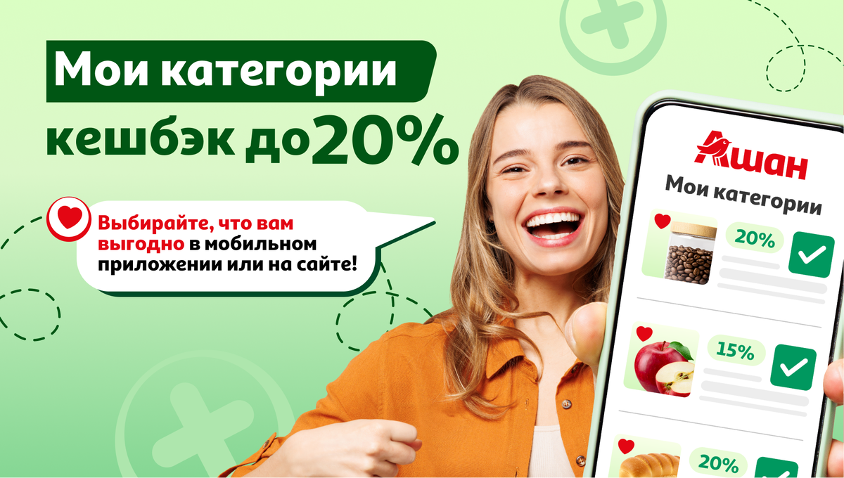 Кто-то не представляет жизни без свежей выпечки, кто-то часто покупает детские товары, а кому-то важны средства для ухода за домом. У каждого любимые категории товаров. И теперь вы сами решаете, что вам выгодно! В программе лояльности Ашан появились «Мои категории». Каждый месяц вы выбираете три категории товаров и получаете повышенный кешбэк до 20% на покупки в этих категориях! Как выбрать «Мои категории» на сайте auchan.ru? 1. Авторизуйтесь на сайте auchan.ru и перейдите в раздел «Карта АШАН» в верхнем меню. 2. В меню слева откройте блок «Мои категории». 3. Выберите три категории из списка и подтвердите свой выбор. Готово! Теперь при покупке товаров из этих категорий — как онлайн, так и в магазинах — вам будет начисляться повышенный кешбэк. Как выбрать «Мои категории» в мобильном приложении «Мой Ашан»? Настроить категории в приложении так же просто. 1. Откройте приложение «Мой Ашан». 2. На главном экране в разделе «Мои предложения» нажмите на «Выбрать категории». 3. Отметьте нужные