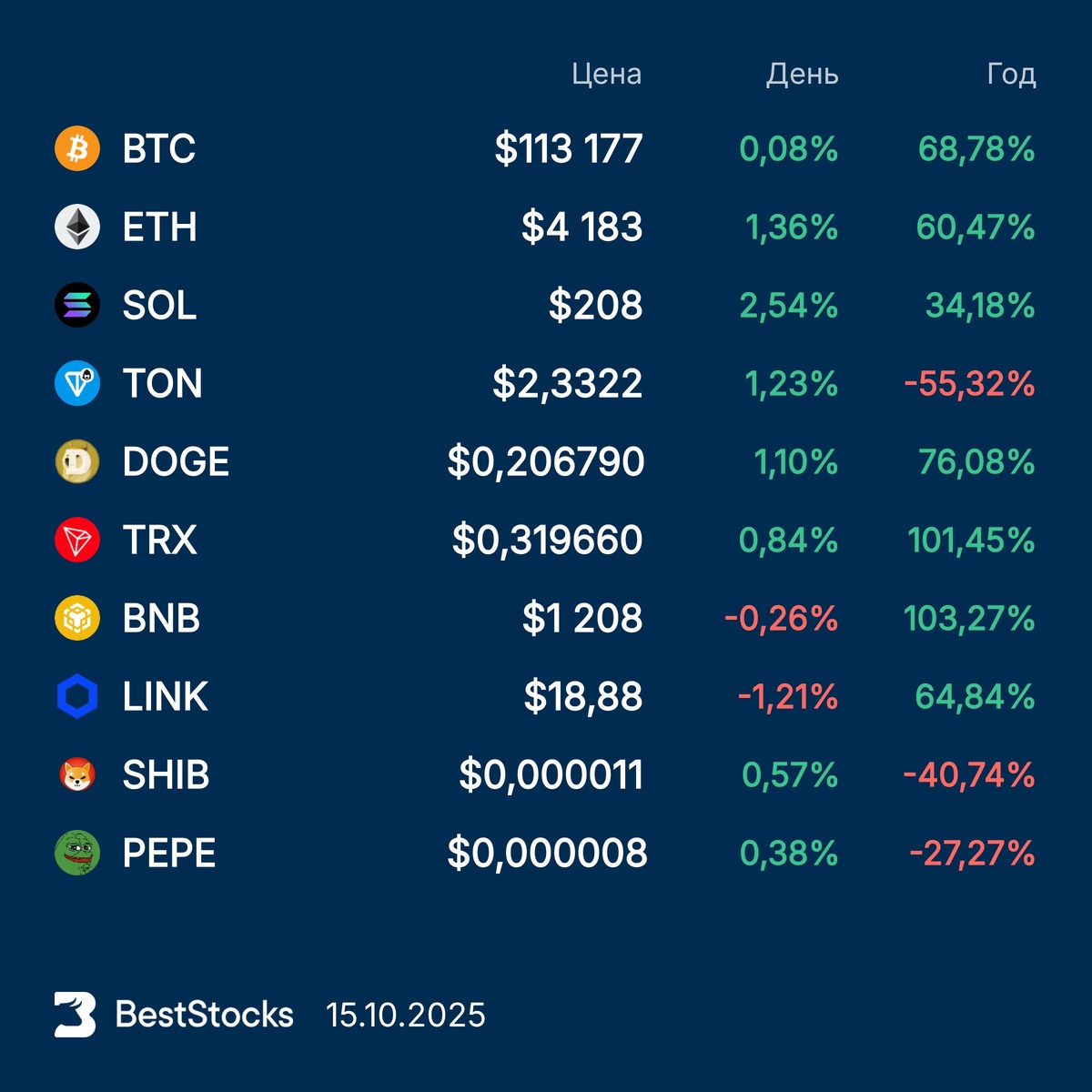 Курсы основных криптовалют: Bitcoin, Etherium, Solana, Toncoin, Dogecoin, TRON, BNB, Chainlink, Pepe, Shiba Inu на текущий момент
