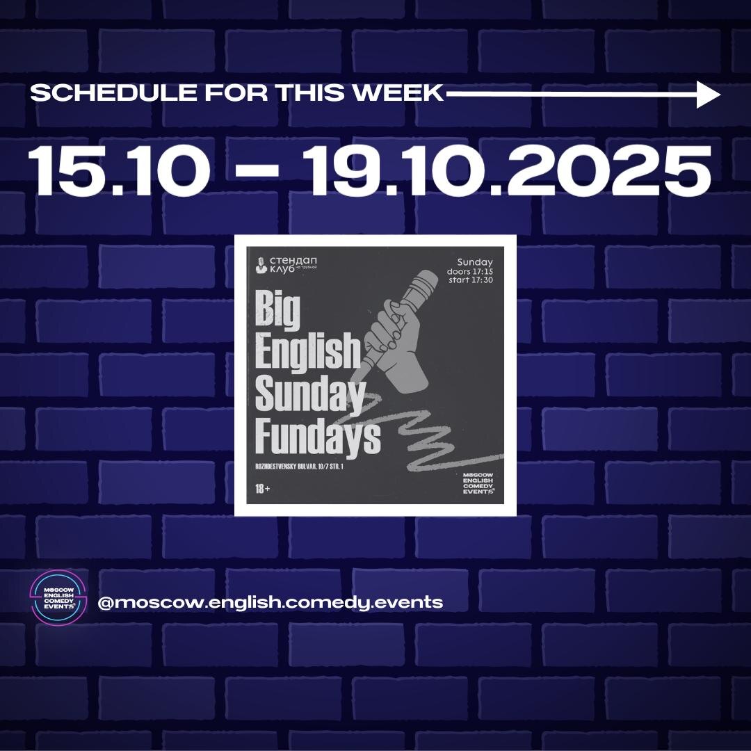 Schedule for this week (15.10 – 19.10)❗️ -----‐----------------------- Still Sexy Saturdays 🎤 Open Mic ❌ POSTPONED UNTIL OCTOBER 25TH❌ -----‐----------------------- 🕠Sunday, October 19th, 5:30 PM - Big English Sunday Fundays 📺Special appearances by famous Russian comics 🎟️Entrance: FREE 💸 Donations welcome, one drink minimum 🔗Reserve for free 📍Stand Up Club на Трубной 🗺 Map: Rozhdestvensky Blvd, 10/7 С1