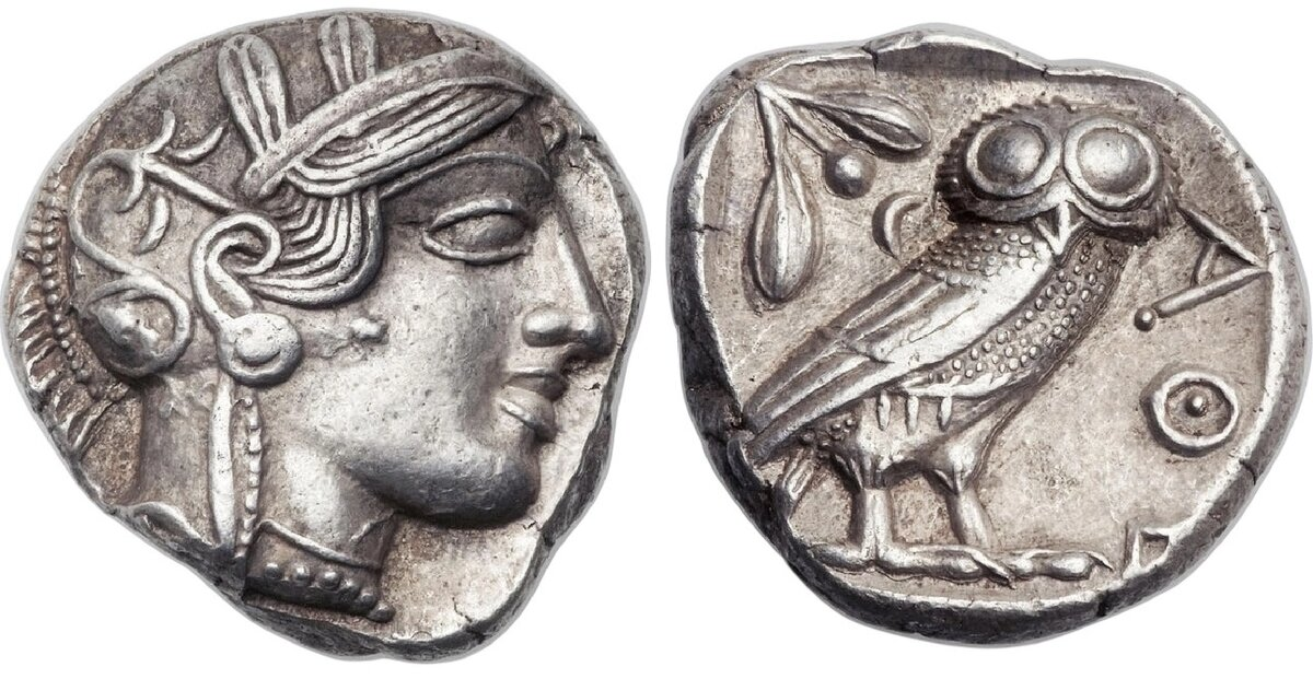 "Продажа "древностей" под брендом вымышленных цивилизаций — очень старый и почетный бизнес." Тетрадрахма, якобы "Древняя Греция", якобы V век до нашей эры. На аверсе профиль Афины в боевом шлеме. На реверсе – сова, священная птица, символ мудрости и проницательности (чей облик могла принимать Афина).