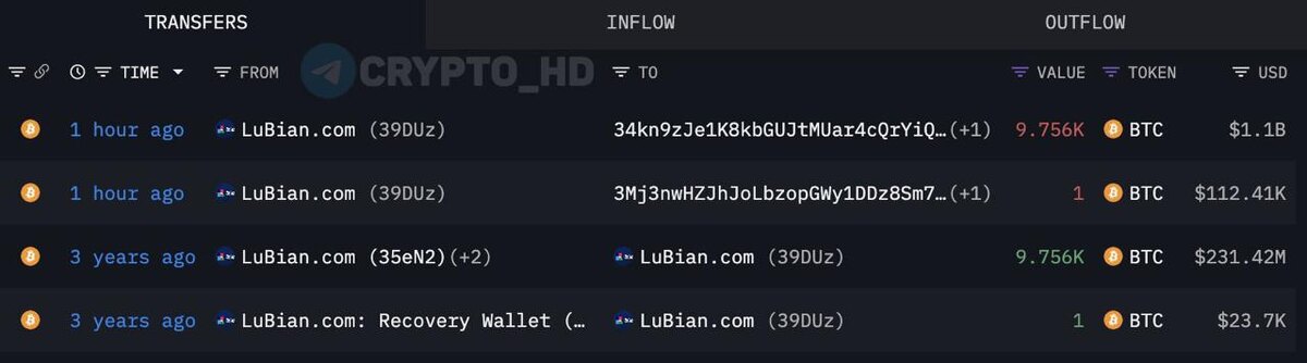 👀 Один из кошельков LuBian «проснулся» после 3 лет бездействия – перевел все 9757 BTC ($1,1b) на новые адреса