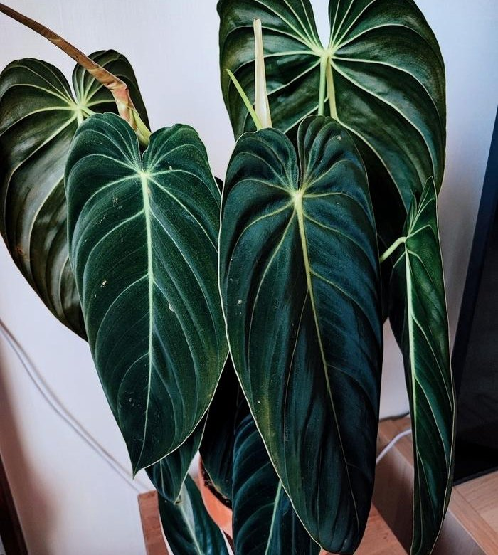 Если вам хочется настоящего «вау»-эффекта без ярких цветов, присмотритесь к филодендрону меланохризум (Philodendron melanochrysum). Его длинные бархатные листья с глубокими жилками и золотистым подсвечиванием выглядят как дизайнерская ткань, а взрослые пластины легко достигают 40–70 см при правильной опоре. Экзотика, которая превращает угол комнаты в тропический подиум.