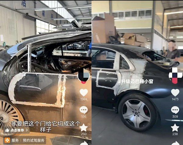 Нет, речь не о напоминающем Maybach лимузине от какого-то местного бренда с непроизносимым названием. И даже не о решётках и шильдиках с двойной буквой М на обычных S-классах. Китайцы пошли дальше и начали перепиливать проём задней двери длиннобазного S-класса (V223), чтобы получилось боковое окошко внутри задней стойки – как в настоящем S Maybach (код кузова Z223). А по сути эта операция заключается в укорачивании задней двери. Делают это в основном для того, чтобы катать свадьбы. Сдать такой почти Maybach в аренду можно в полтора раза дороже, чем обычный S-класс – китайцы очень падки на элементы престижа, поэтому очень желательно чтобы на мероприятии было всё самое дорогое и статусное. А обходится владельцам прокатных парков такой автомобиль с учетом всех кузовных работ намного дешевле, чем покупка настоящего Майбаха. Ведь разница в цене между длинным S-классом и Maybach – примерно 100%. И какая арендатору разница, что Maybach не настоящий – у него даже колёсная база получается мен