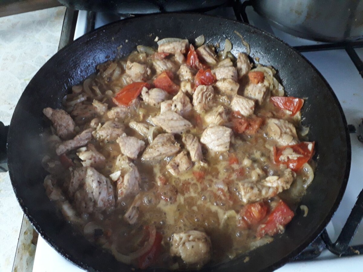 - Добавьте лук и помидоры или морковь (если используете) к свинине, обжаривайте еще 3-5 минут, пока лук не станет мягким.