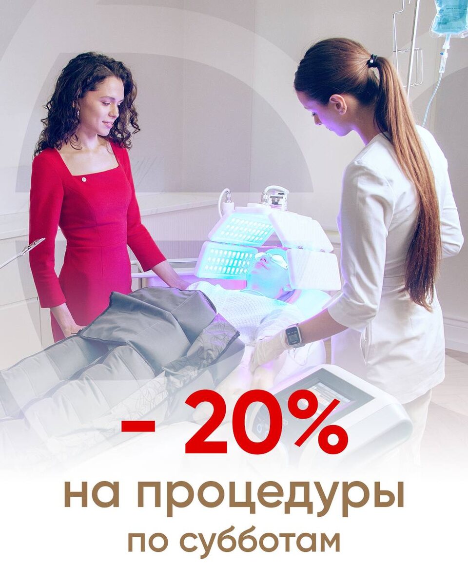 -20% НА ПРОЦЕДУРЫ В СУББОТУ Записывайтесь на процедуры по бьюти-субботам в октябре и получайте скидку 20% на процедуры клиники. Количество мест ограничено. Успейте забронировать место на процедуру. *НЕ распространяется на услуги Главного врача, Coolsculpting/ Ulthera/ Перманентный макияж/ Лаб. исследования/ Удаление новообразований и ПМ/ Консультации/ Анестезию/ Косметику/ Протоколы лечения акне/ Авторские протоколы **Скидки не суммируются с персональными скидками, специальными предложениями и абонементами