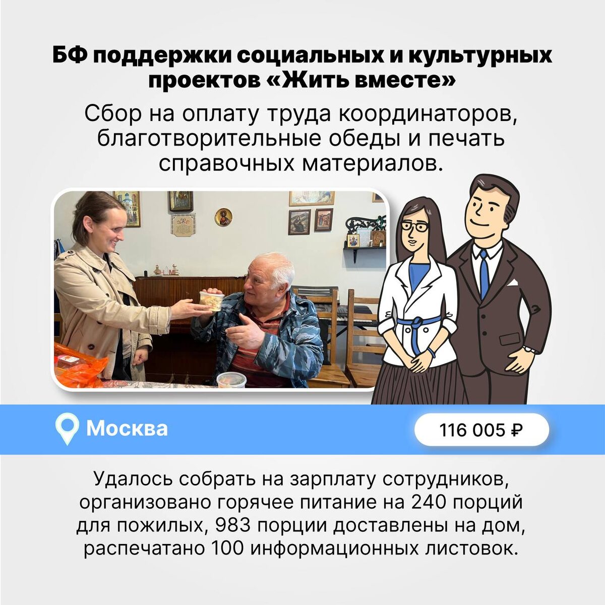 Подробности отчетов и фото вы можете увидеть по ссылкам: 👍 Сбор средств на оплату труда социальных координаторов, проведение благотворительных обедов и печать справочных материалов. 👍 Сбор средств на уход нянь во время обследования детей-сирот со спина-бифида. 👍 Сбор средств на зарплату сотрудника приемки в течение 5 месяцев. @mirom_help – платформа поддержки православной благотворительности «Поможем»
