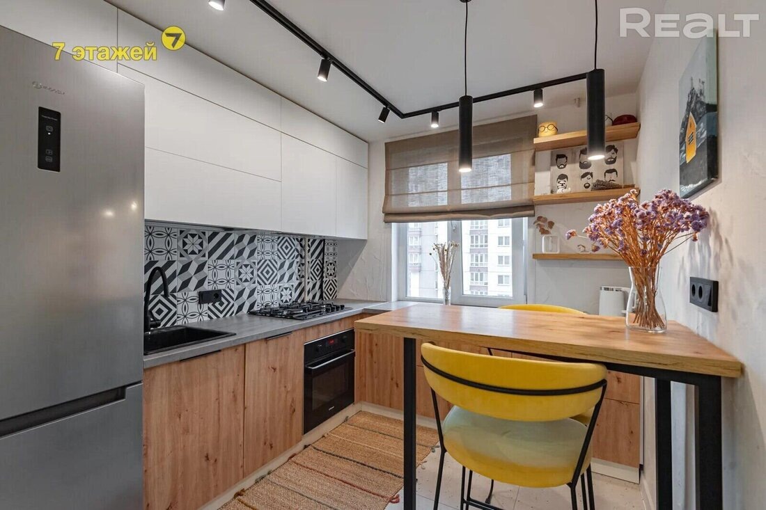 В панельном доме около Лошицкого парка продается стильная однокомнатная квартира. Жилье подготовили для проживания без дополнительных вложений: сделали хороший ремонт, поставили мебель и технику. Взгляните, как тут разделили зоны и подобрали цвета. Цену тоже пишем. Кстати, эту однушку можно купить в лизинг — бесплатная консультация вот тут. Девятиэтажный панельный дом на Бородинской, 17/2 построили в 1986 году. На седьмом этаже тут продается однокомнатная квартира площадью 37,2 м². На кухню приходится 7 квадратов. Жилье полностью готово к проживанию. Здесь сделан хороший светлый ремонт: стены отделаны декоративной штукатуркой, на полу лежат ламинат и плитка. В комнате и кухне продумано несколько сценариев освещения. Квартира укомплектована мебелью и бытовой техникой. Например, в кухне есть холодильник, посудомоечная машина, газовая панель и духовой шкаф. Комната разделена на две зоны реечной перегородкой. Около окна разместилась спальня, на второй половине — гостиная с диван и телевиз