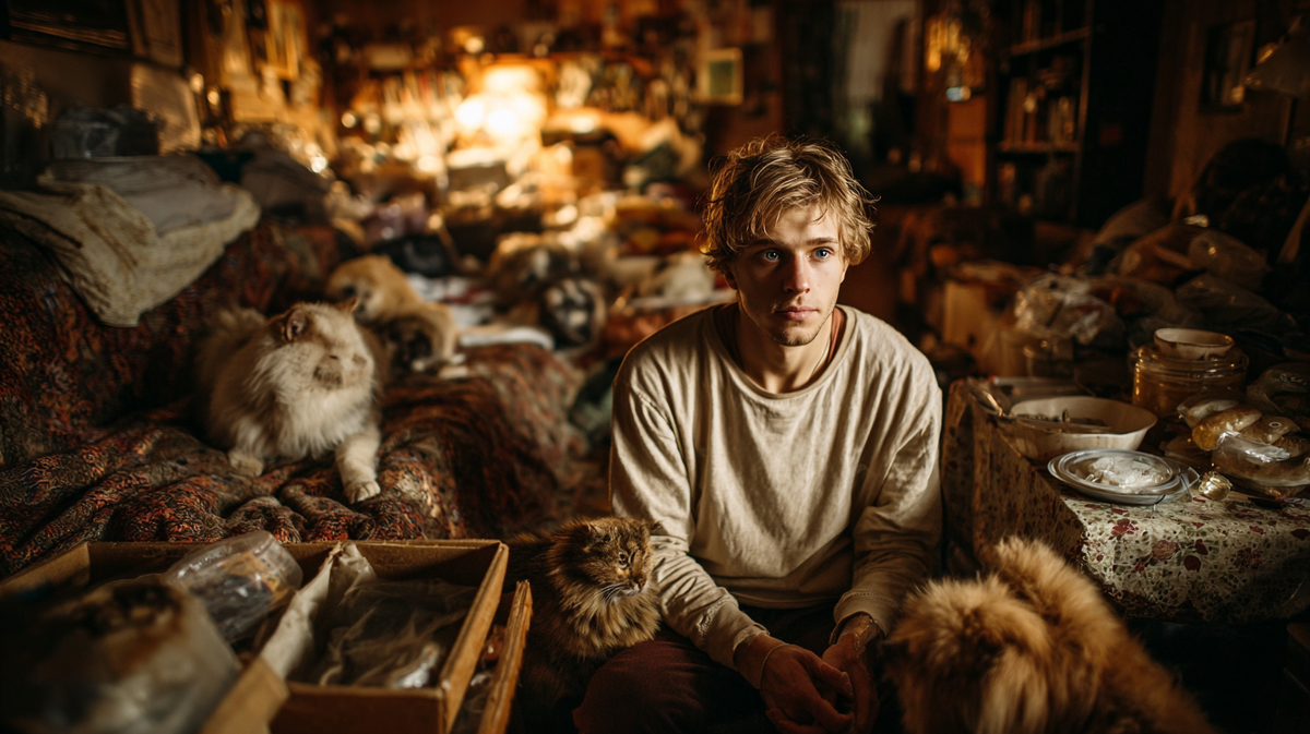 Квартира превратилась в... он даже не мог подобрать слово. Хлев? Помойка? Всё было в шерсти, в грязи, в экскрементах. Воняло так, что дышать было невозможно. Животные лежали везде – на мебели, на полу, на подоконниках. Лена сидела посреди этого кошмара, в грязной одежде, с всклокоченными волосами.