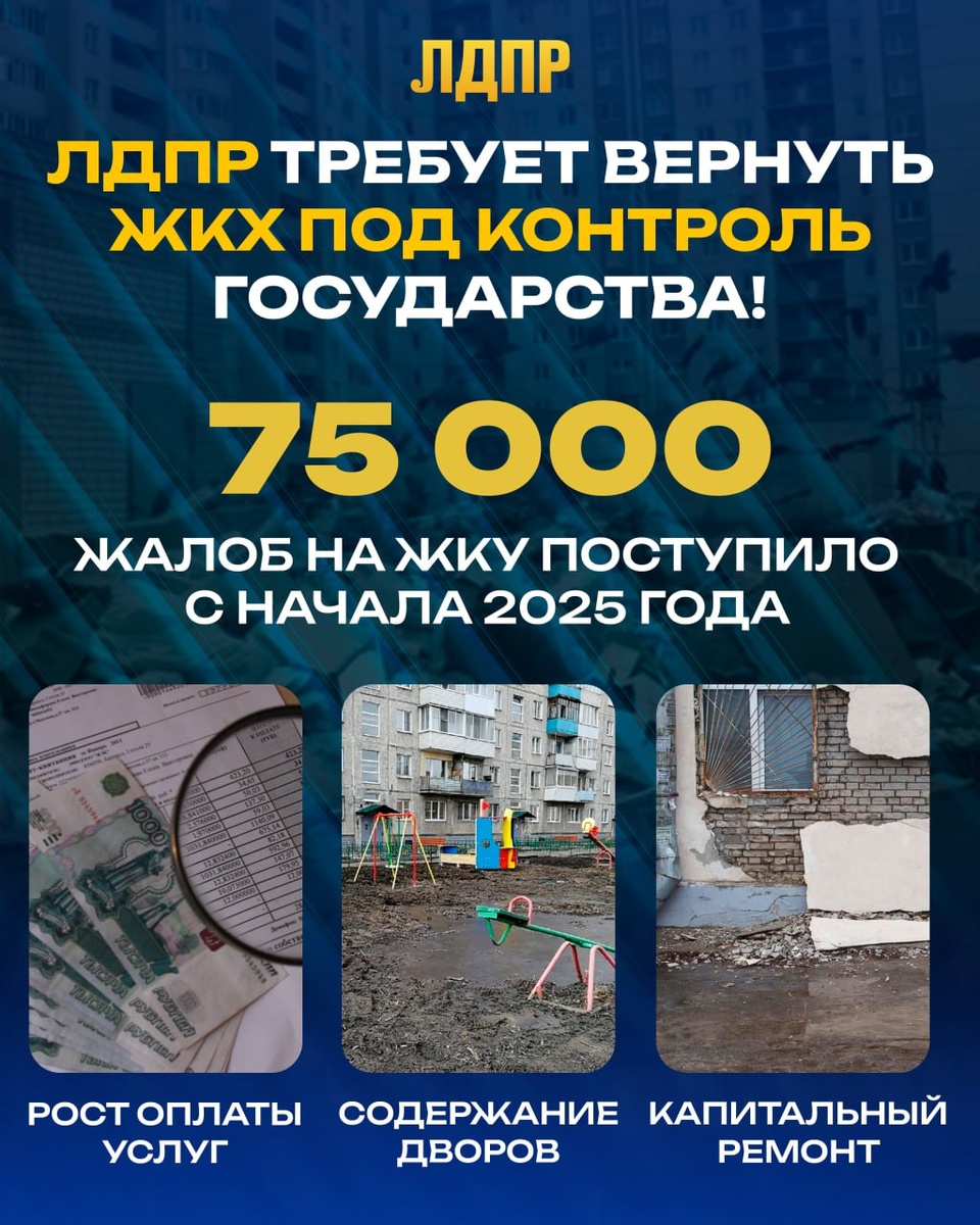 В Москве платят больше всех, а качество ЖКХ оставляет желать лучшего! ЛДПР ТРЕБУЕТ ВЕРНУТЬ ЖКХ ПОД КОНТРОЛЬ ГОСУДАРСТВА! Москвичи ежегодно становятся заложниками неэффективной системы ЖКХ. Столица — один из самых дорогих для жизни городов, и коммунальные платежи бьют по карману каждой семьи, особенно пенсионеров и молодых родителей. 📃 По данным Мосжилинспекции, только за первое полугодие 2025 года поступило свыше 75 тысяч обращений от москвичей, недовольных работой своих управляющих компаний. Лидеры жалоб — некачественное содержание дворов, проблемы с капитальным ремонтом и бесконечный рост платы за содержание жилья. 📈При этом износ коммунальной инфраструктуры в отдельных районах Москвы, особенно в старом фонде и некоторых районах ТиНАО, остается критическим. Система, отданная на откуп частным компаниям, работает не на людей, а на извлечение прибыли. ⚠️ЛДПР ТРЕБУЕТ ВЕРНУТЬ ЖКХ ПОД КОНТРОЛЬ ГОСУДАРСТВА! Наш лидер Леонид Слуцкий озвучил конкретный план, как навести порядок в отрасл