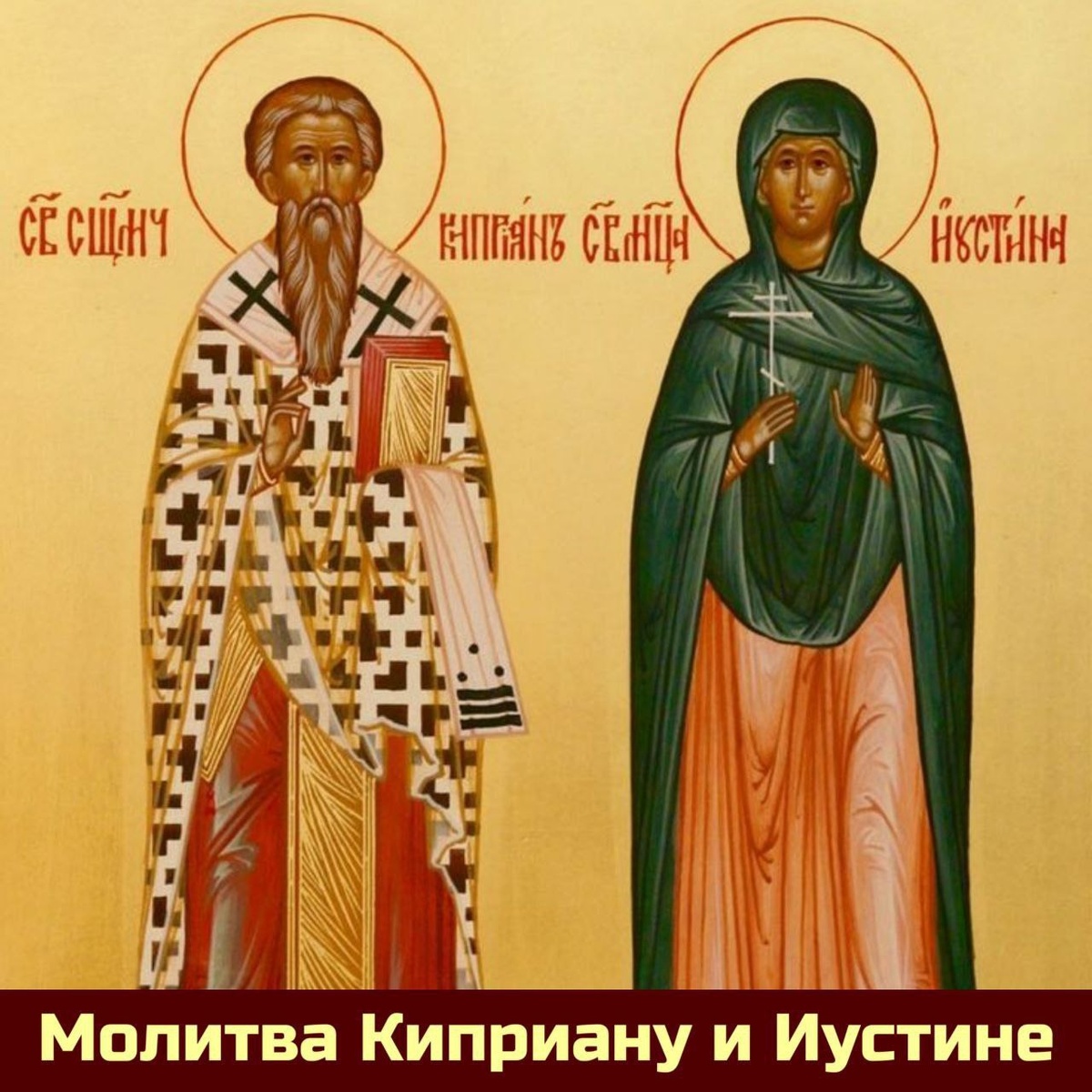 Молитва святым Киприану и Иустине на русском языке. О святые священномученик Киприан и мученица Иустина! Внемлите смиренному молению нашему. Ведь хотя вы временную жизнь свою мученичеством за Христа окончили, но духом от нас не отступаете, всегда по заповедям Господним шествовать нас научая и крест свой терпеливо нести нам помогая. Вы имеете дерзновение пред Христом Богом и Пречистою Его Матерью, потому и ныне будьте молитвенниками и ходатаями за нас, недостойных (имена). Будьте нам сильными защитниками, чтобы заступничеством вашим сохраняемы мы были невредимыми от бесов, колдунов и злых людей, славя Святую Троицу: Отца и Сына и Святого Духа, ныне и присно, и во веки веков. Аминь. Святые Киприан и Иустина, молите Бога о нас! Будьте здравы духом и телом и хранимы Богом от всякого зла молитвами святых!