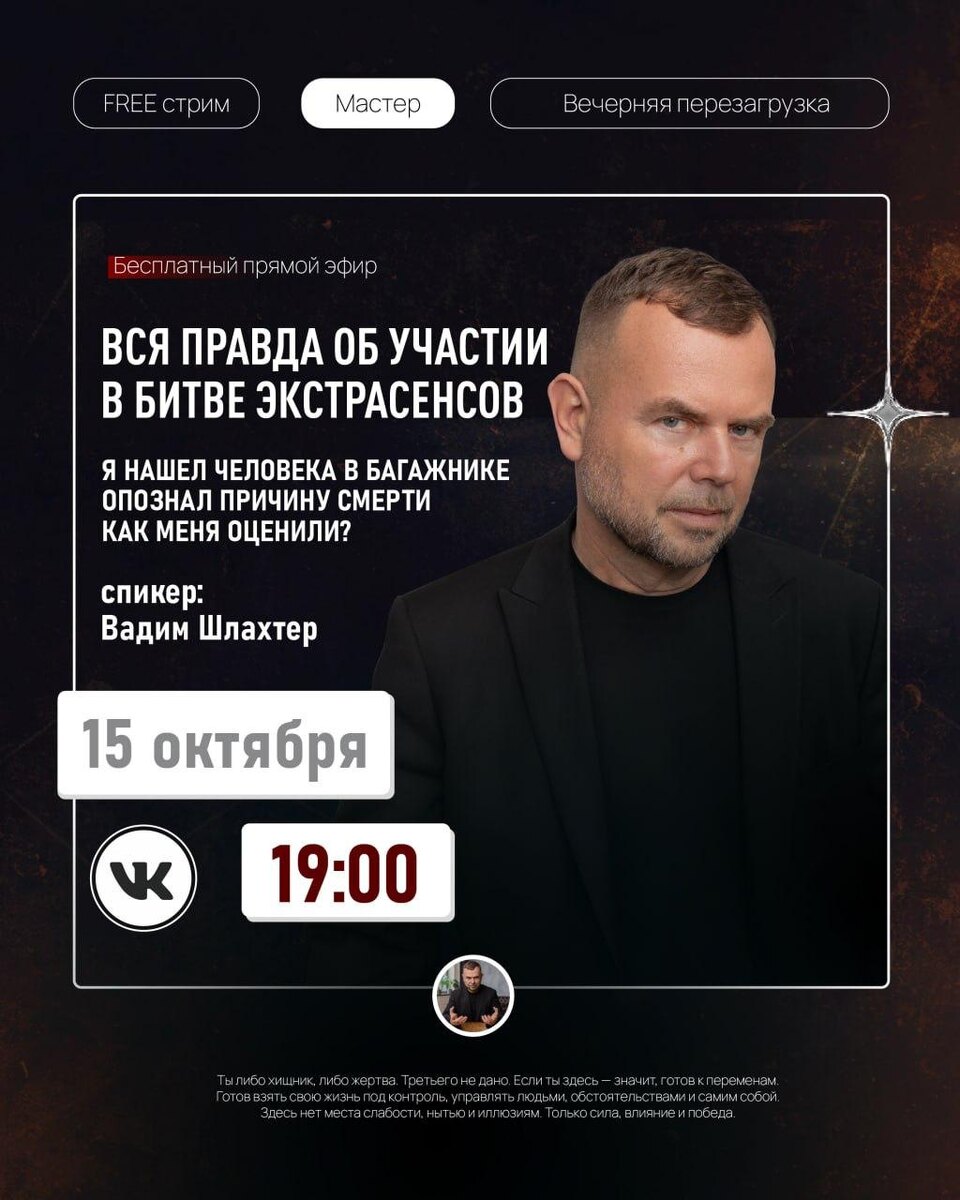 🎤Бесплатный стрим «Вся правда об участии в Битве Экстрасенсов». Задавайте свои вопросы по теме в комментариях к этому посту — на все отвечу в прямом эфире. ⏳ 15 октября в 19:00 (длительность до 30 минут) 🕙 Подключайся только Вконтакте. Я провожу «Вечернюю перезагрузку» каждую среду. Запись эфира выложу в частном канале. Обо мне | Благодарность команде | Навигация