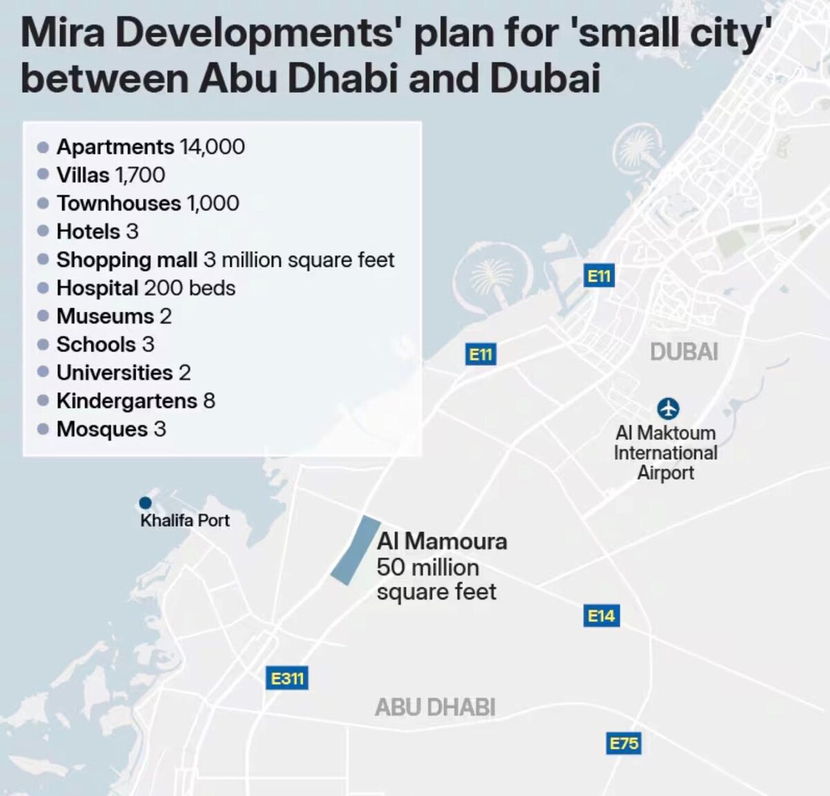 Между Абу-Даби и Дубаем построят новый «мини-город» стоимостью 55 млрд AED ($15 млрд) с жилыми кварталами, ТЦ, отелями, школами