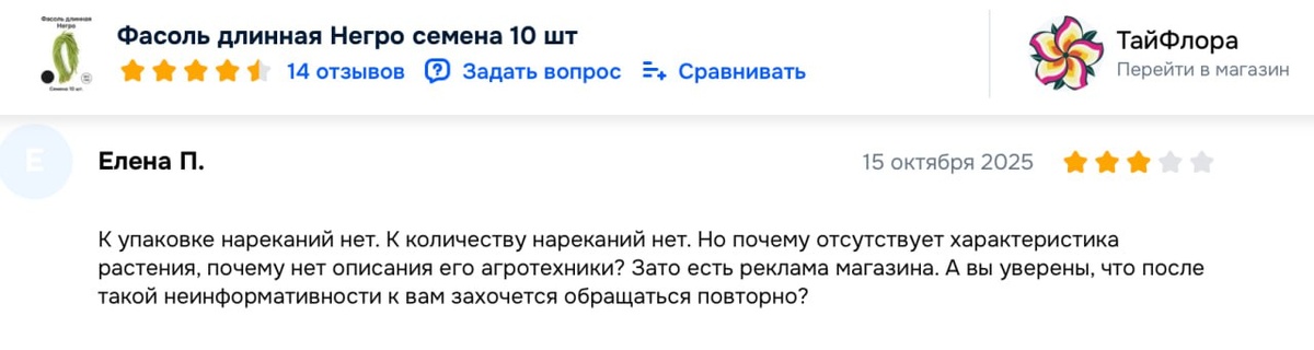 Ещё один отзыв из серии «читать долго, писать быстро» 😅 Вся агротехника и описание — прямо в карточке товара. Инструкции я не кладу — всё уже там. А листовка с «рекламой» — просто мои контакты, чтобы можно было связаться, если что-то не так. Елена, если вы в этом чате, поясните ваш отзыв 🤔 Интересно, а Елена уверена, что после такого отзыва я захочу ей еще что-то отправлять 😅
