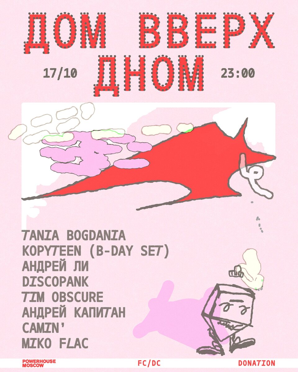 Дом Вверх Дном в Powerhouse 17 октября Оставь логику у дверей и ныряй в ночь, где всё можно — наша любимая вечеринка Дом Вверх Дном возвращается, чтобы перевернуть твое представление о реальности. Лайн-ап: Tania Bogdania Kopyteen (b-day set) Андрей Ли Discopank Tim Obscure Андрей Капитан Camin’ Miko Flac 🎫 Вход: donation FC/DC 18+ 📆 17 октября, 23:00 📍 Powerhouse, Москва, Гончарная ул., 7/4с1