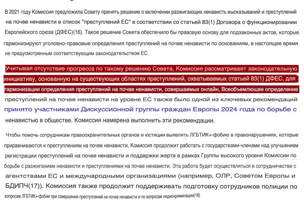 🇪🇺Европейская комиссия работает над новой законодательной инициативой по статье 83(1) ДФЕС, чтобы создать общесоюзное определение «преступлений на почве ненависти в интернете» и уже на законных основаниях сажать за мнение, высказанное в комментариях. Одновременно новая стратегия равенства LGBTIQ+ на 2026–2030 годы предусматривает, что пол можно будет определять самостоятельно без возрастных ограничений — в том числе для несовершеннолетних. Критики предупреждают: Это открывает двери для государственных вмешательств в язык, образование и идентичность — под прикрытием «толерантности» и «безопасности в сети». Впрочем, как всегда, эти предупреждения остаются неуслышанными, а понятие «мыслепреступление» перекочевывает из художественной литературы («1984») в юридическую и судебную практику. Подпишись на Телеграм Александр Семченко