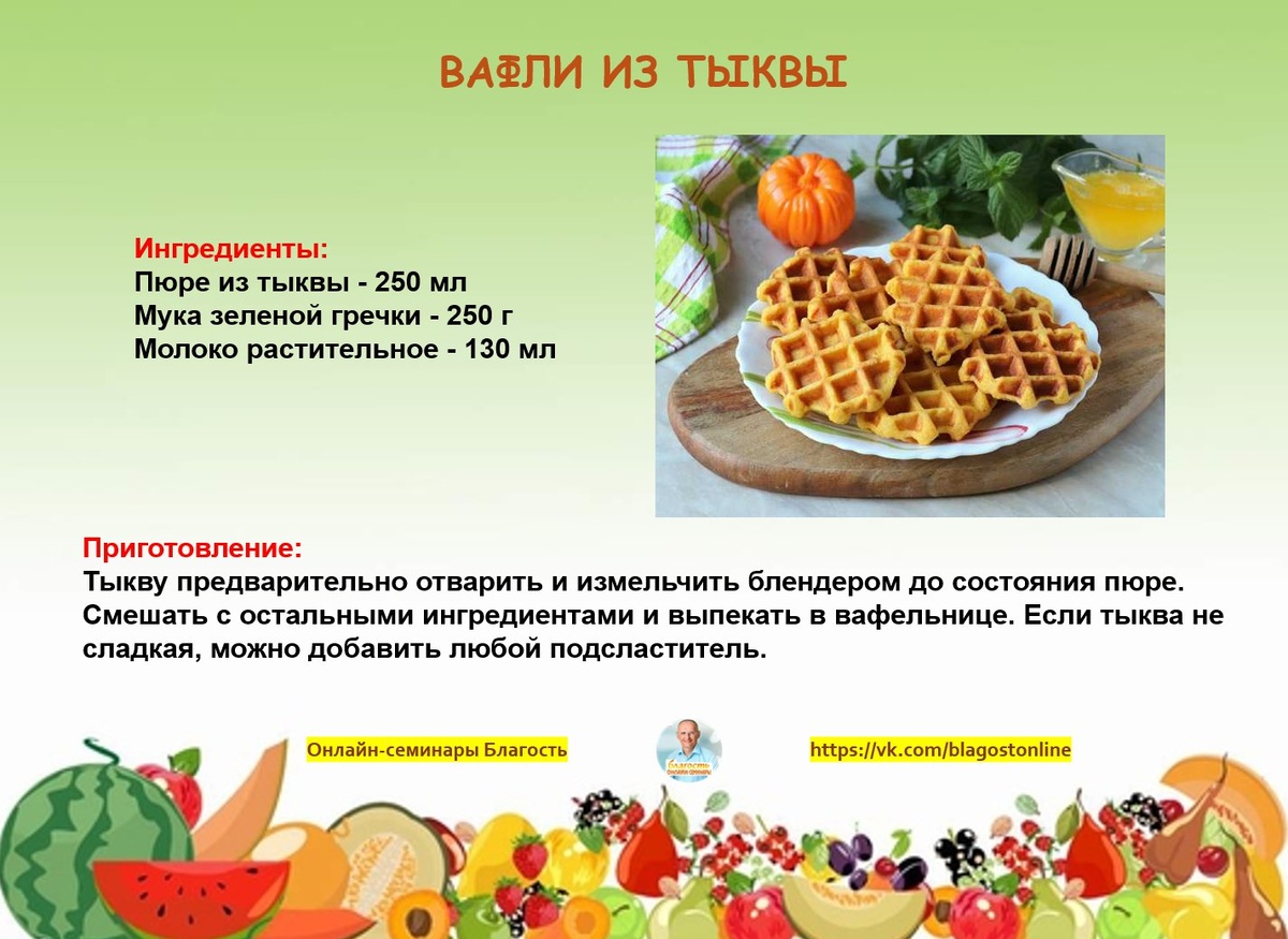 🍰 ВАФЛИ ИЗ ТЫКВЫ 🌀 Ингредиенты: Пюре из тыквы - 250 мл Мука зеленой гречки - 250 г Молоко растительное - 130 мл 🌀 Приготовление: Тыкву предварительно отварить и измельчить блендером до состояния пюре. Смешать с остальными ингредиентами и выпекать в вафельнице. Если тыква не сладкая, можно добавить любой подсластитель.