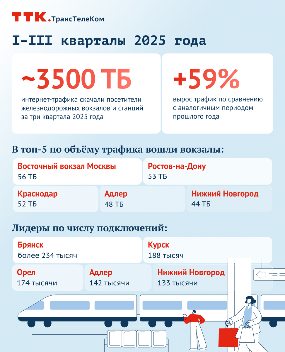 Почти 3,5 тысячи терабайт интернет-трафика скачали посетители железнодорожных вокзалов и станций за три квартала 2025 года. По сравнению с аналогичным периодом прошлого года потребление выросло на 59%. Оператором сервиса беспроводного доступа в интернет выступает АО «Компания ТрансТелеКом». В пятерку лидеров по объему потребления трафика вошли вокзалы Восточный (Москва, 56 Тб), Ростов-на-Дону (53 Тб), Краснодар (52 Тб), Адлер (48 Тб), Нижний Новгород (44 Тб). По числу подключений впервые лидирует Брянск (более 234 тысяч сессий). Далее следуют Курск (188 тысяч), Орел (174 тысяч), Адлер (142 тысяч), Нижний Новгород (133 тысяч). «Организация публичного беспроводного доступа в интернет на вокзалах и станциях является важным элементом формирования современной цифровой среды. Услуга выходит за рамки сервисной функции, обеспечивая для пассажиров и посетителей вокзалов устойчивую коммуникацию и своевременный доступ к информации», – прокомментировал Константин Болтрукевич, заместитель Генеральн