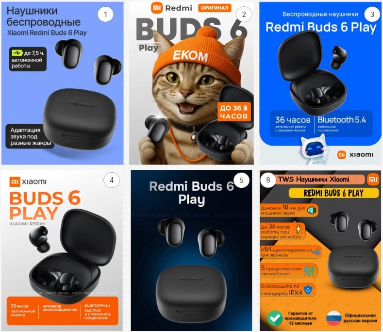 Пример взяла именно тот, который приводили в чате курса - беспроводные наушники Xiaomi, и чтобы сравнивать - конкретной модели - Redmi Burds 6 Play.