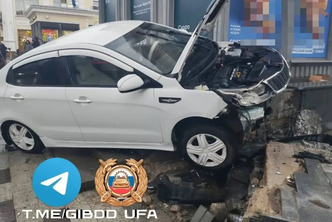 ДТП произошло накануне на перекрестке улиц Октябрьской Революции и Ленина в башкирской столице. Автомобиль марки Kia Rio врезался в одно из административных зданий.