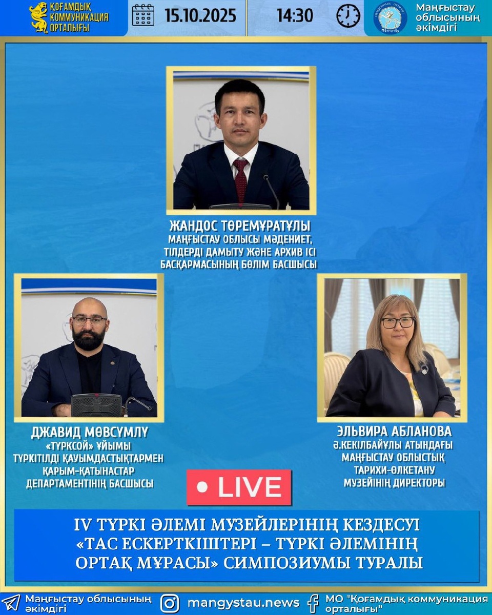 Тақырыбы: IV Түркі әлемі музейлерінің кездесуі «Тас ескерткіштері – түркі әлемінің ортақ мұрасы» симпозиумы туралы Спикерлер: Жандос Төремұратұлы - Маңғыстау облысы мәдениет, тілдерді дамыту және архив ісі басқармасының бөлім басшысы Джавид Мөвсүмлү - «Түрксой» ұйымы түркітілді қауымдастықтармен қарым-қатынастар департаментінің басшысы Эльвира Абланова - Ә.Кекілбайұлы атындағы Маңғыстау облыстық тарихи-өлкетану музейінің директоры Модератор: Ботакөз Рахманова https://www.facebook.com/cok.mangystau/videos/812484761161846