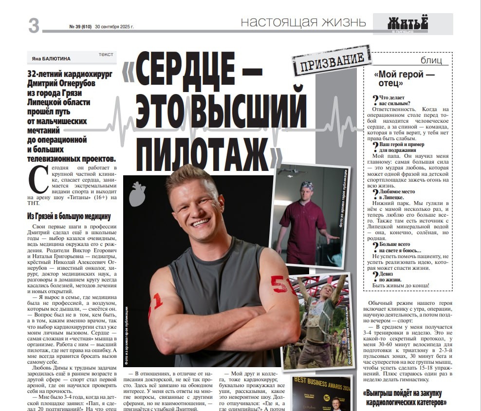 Меня зовут Дима, мне 32 года, и я тот самый парень из Грязей, который однажды решил, что хирургия и триатлон — это, в общем-то, одно и то же. В детстве отец научил меня хитрости: он говорил, что я "машина", пока я висел на турнике. Этой одной фразой он зажег огонь, который не гаснет до сих пор. Моя спортивная карьера — это попытка вернуться в то мгновение, когда ты веришь, что можешь всё. Я не мог не стать врачом. Мои родители — педиатры, крестный — хирург-онколог. С детства я дышал "бациллами" и научными открытиями. Но выбор пал на кардиохирургию — это высший пилотаж. Сердце — самая сложная и самая честная мышца. Это ювелирная точность, инженерная задача и огромное доверие. Я люблю самые сложные вызовы. Как я совмещаю операционную и экстремальный спорт? Для меня спорт — это врачебное убеждение. Я вижу, что дает движение сосудам и сердцу. Это не просто слова для пациента, это живой пример. После победы в шоу «Вызов» я получил бесценный «цифровой детокс» и, главное, возможность. Весь в