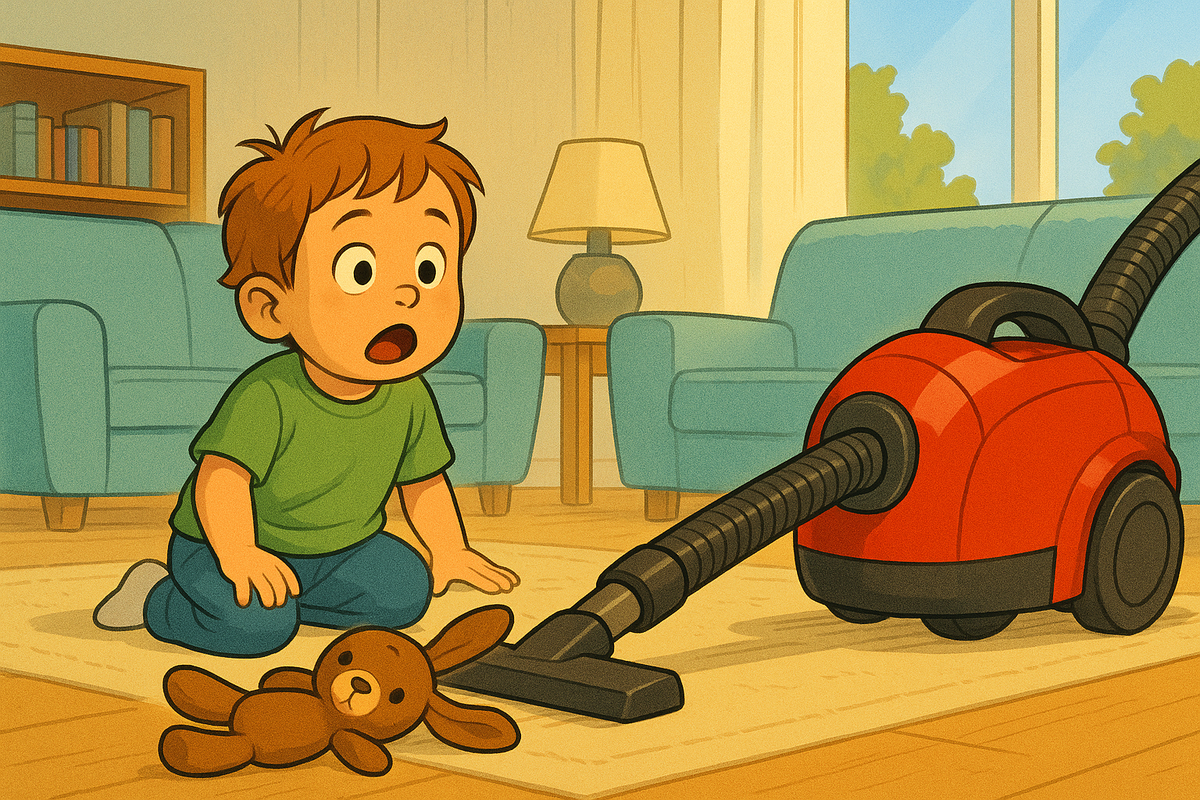 Вечером в детской комнате стоял мягкий медвежонок — любимая игрушка дочки. Пылесос был запущен на уборку, и всё шло по плану, пока он не наткнулся на мишку. Вместо того чтобы объехать или остановиться, пылесос зацепил лапку игрушки щёткой и потащил за собой. Дочь заметила и закричала: