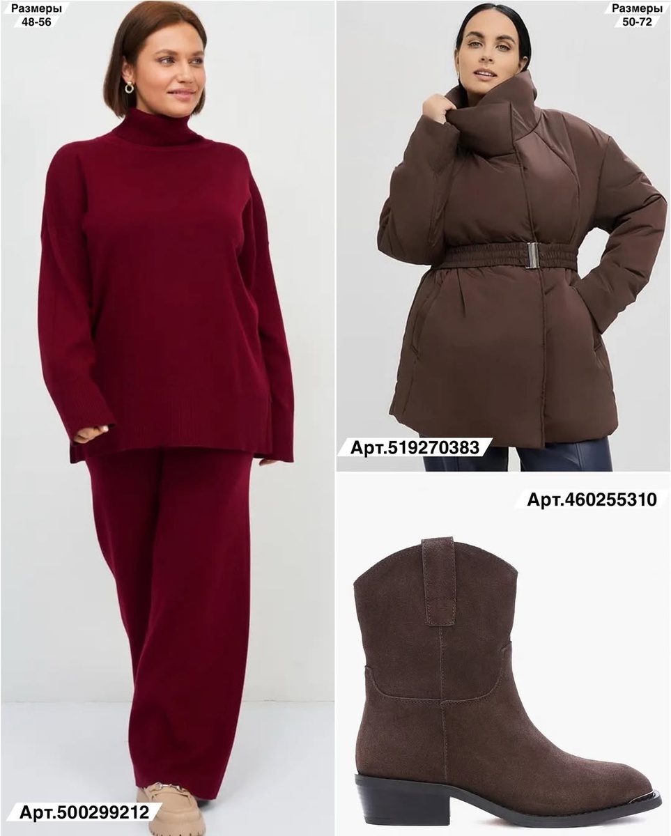 Зимой особенно хочется тепла и ухоженности. Секрет — в благородных оттенках, мягких фактурах и правильных линиях. Я собрала два законченных комплекта из актуальных находок: тёплая «вишнёво-шоколадная» капсула для спокойных будней и более смелый городской образ с мини и высоким сапогом. Иду строго по порядку артикулов с фото. У каждой позиции — подробное описание и совет стилиста.