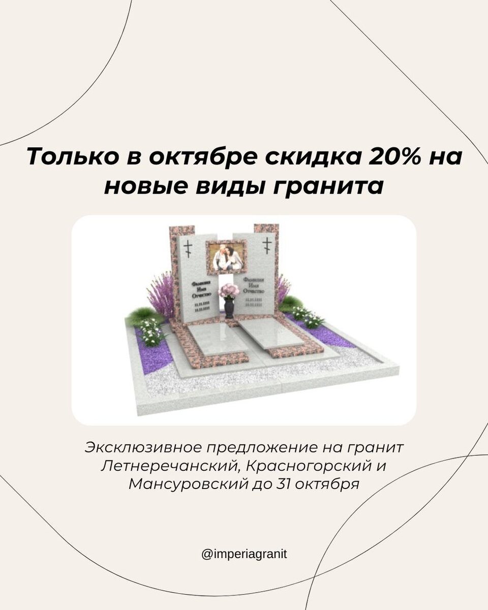 🎉 Только в октябре! Империя гранита дарит скидку 20% на новые виды камня: Летнеречанский, Красногорский и Мансуровский. Эти породы отличаются прочностью, благородным блеском и красотой, которая сохраняется веками. Акция действует до 31 октября. Успейте выбрать памятник по особой цене. 📲 Заявку можно оставить на сайте, по телефону или в Direct.