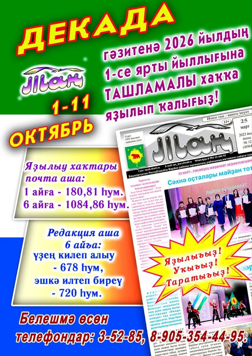 1-11 октябрҙә 2026 йылдың тәүге яртыһына «Таң» гәзитенә 10% ташлама менән яҙылырға мөмкин. ✅Декада осоронда редакцияла яҙылыусылар өсөн: - гәзитте килеп алыу -678 һум, -ойошма-учреждениеларға илтеп биреү - 720 һум. ✅Почта бүлексәләрендә “Таң” гәзитенә ярты йылға 1084 һум 86 тингә яҙылырға мөмкин. Бүләктәр уйнатыу тураһында тулыраҡ.