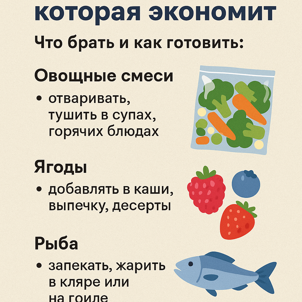 Что брать и как готовить: овощные смеси, ягоды, рыба Хочешь есть полезно и тратить меньше? Заморозка — твой друг: стабильные цены круглый год, меньше отходов, готовка за 10–15 минут. Сохрани статью — это шпаргалка для магазина и кухни. Овощи/смеси: брокколи, цветная, стручковая фасоль, шпинат порционный, горошек, «овощи для жарки», «для супа».