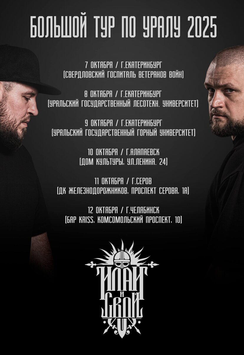 🛑🅰️🅰️🅰️😀🅰️🅰️🅰️🅰️🛑 🛑🅰️🅰️😀🅰️🅰️🅰️🅰️🅰️🛑 Дуэт I.L.A.Y & С.В.О.Й едет на Урал! • 7 октября / г.Екатеринбург Свердловский госпиталь ветеранов войн Вход ограничен, начало в 14:30 • 8 октября / г.Екатеринбург Уральский государственный лесотехнический университет Вход для студентов, начало в 13:30 • 9 октября / г.Екатеринбург Уральский государственный горный университет Вход для студентов, начало в 14:00 • 10 октября / г.Алапаевск Дом культуры, ул.Ленина, 24 Вход свободный, начало в 17:00 • 11 октября / г.Серов ДК Железнодорожников, пр-т Серова, 1А Вход свободный, начало в 11:30 • 12 октября / г.Челябинск Бар KRISS, Комсомольский пр-т, 10 Билеты: +7(351)223-90-11, +7(351)210-21-82 Начало в 19:00 Ждем вас друзья!🔥🎤 VK | Яндекс Музыка | MAX Поддержать музыканта🤙