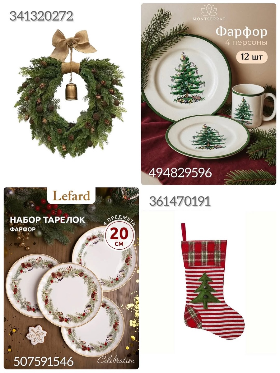 Праздничная атмосфера складывается из мелочей: еловая зелень, тёплый свет свечей, фарфор с зимними сюжетами, чуть-чуть золота и много уюта. Я собрала для вас подборку в единой палитре — молочно-золотая гамма с зелёными акцентами. Иду строго по порядку с артикулами, у каждого предмета — подробное описание и мой практичный совет стилиста.