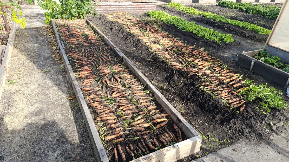 Ну а прореживанием пренебрегла. И, в итоге, получила то, что получила. Для сравнения: морковь 24-го года. И морковь 23-го. Почувствуйте разницу, что называется. Совсем крошечную морковку я отбрасывала в сторону. Получилась неплохая такая ку